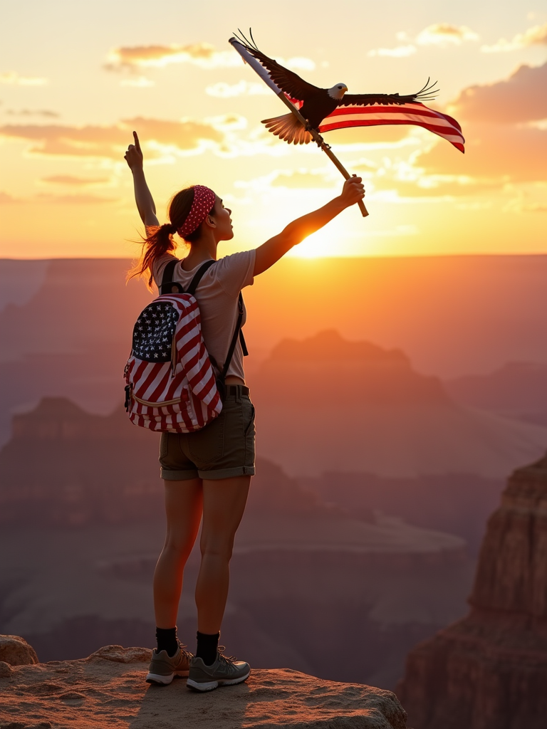 model at the Grand Canyon at sunset, wearing hiking attire with American flag bandana, stars and stripes backpack , proudly holding the American flag high, the majestic natural wonder stretching behind, bald eagle soaring overhead