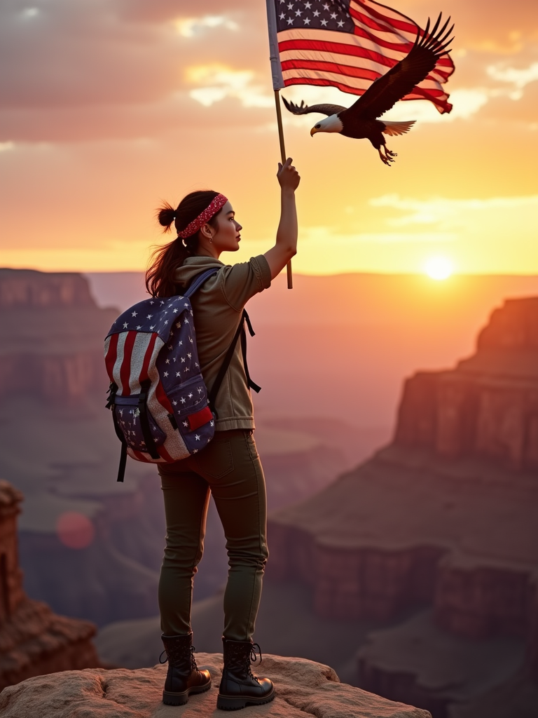 model at the Grand Canyon at sunset, wearing hiking attire with American flag bandana, stars and stripes backpack , proudly holding the American flag high, the majestic natural wonder stretching behind, bald eagle soaring overhead
