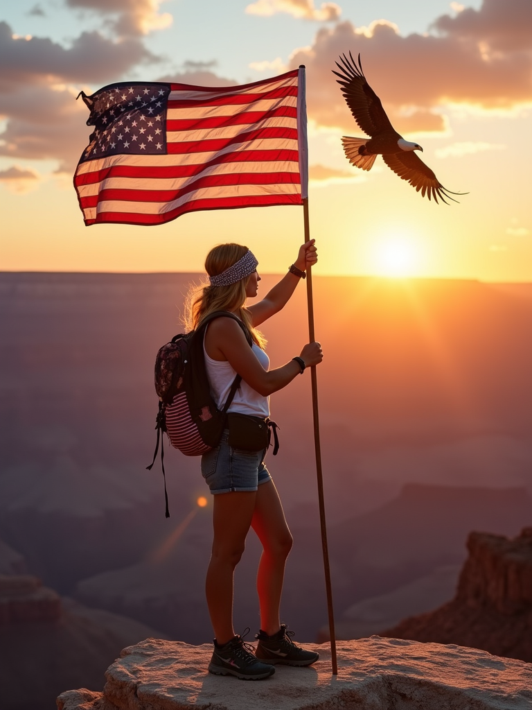 model at the Grand Canyon at sunset, wearing hiking attire with American flag bandana, stars and stripes backpack , proudly holding the American flag high, the majestic natural wonder stretching behind, bald eagle soaring overhead