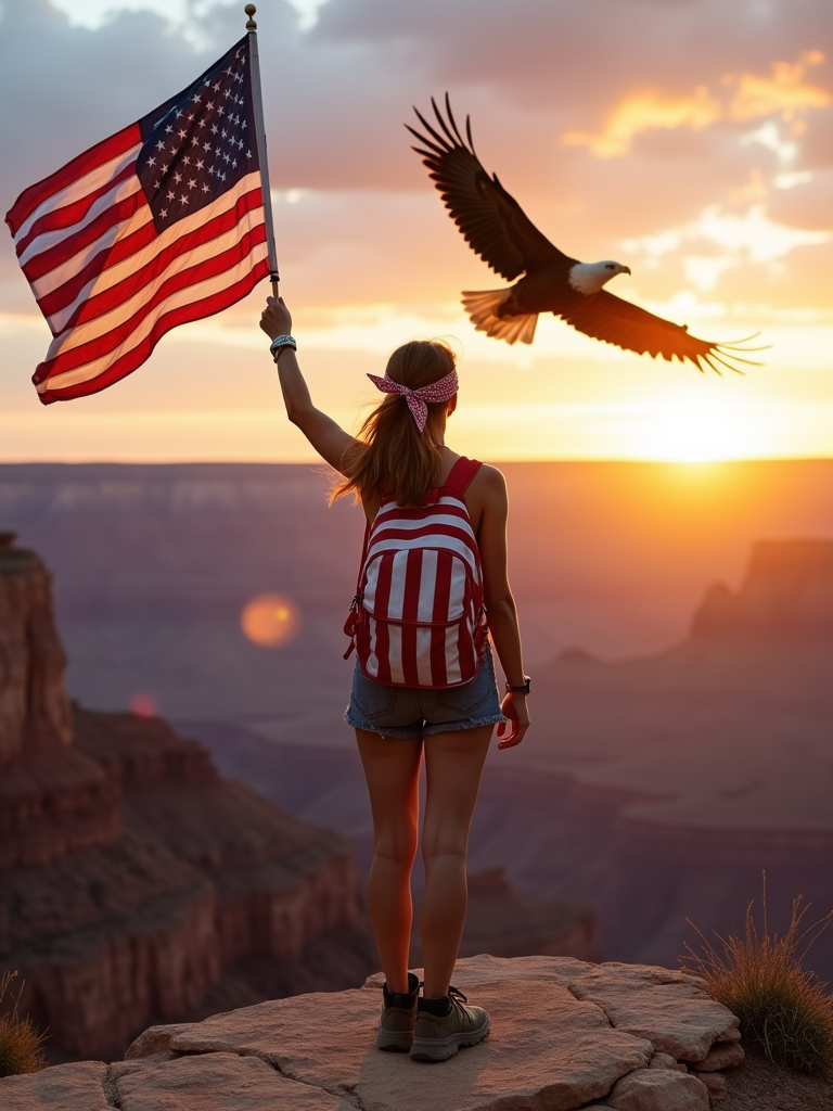 model at the Grand Canyon at sunset, wearing hiking attire with American flag bandana, stars and stripes backpack , proudly holding the American flag high, the majestic natural wonder stretching behind, bald eagle soaring overhead