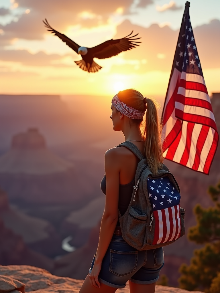 model at the Grand Canyon at sunset, wearing hiking attire with American flag bandana, stars and stripes backpack , proudly holding the American flag high, the majestic natural wonder stretching behind, bald eagle soaring overhead
