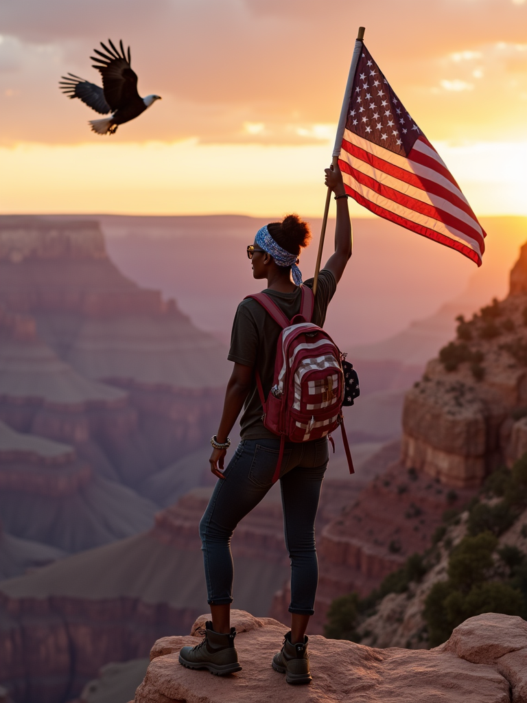 model at the Grand Canyon at sunset, wearing hiking attire with American flag bandana, stars and stripes backpack , proudly holding the American flag high, the majestic natural wonder stretching behind, bald eagle soaring overhead