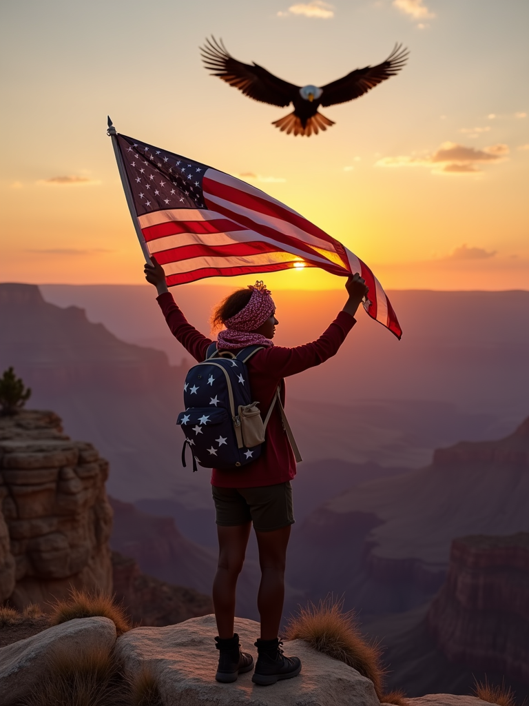 model at the Grand Canyon at sunset, wearing hiking attire with American flag bandana, stars and stripes backpack , proudly holding the American flag high, the majestic natural wonder stretching behind, bald eagle soaring overhead