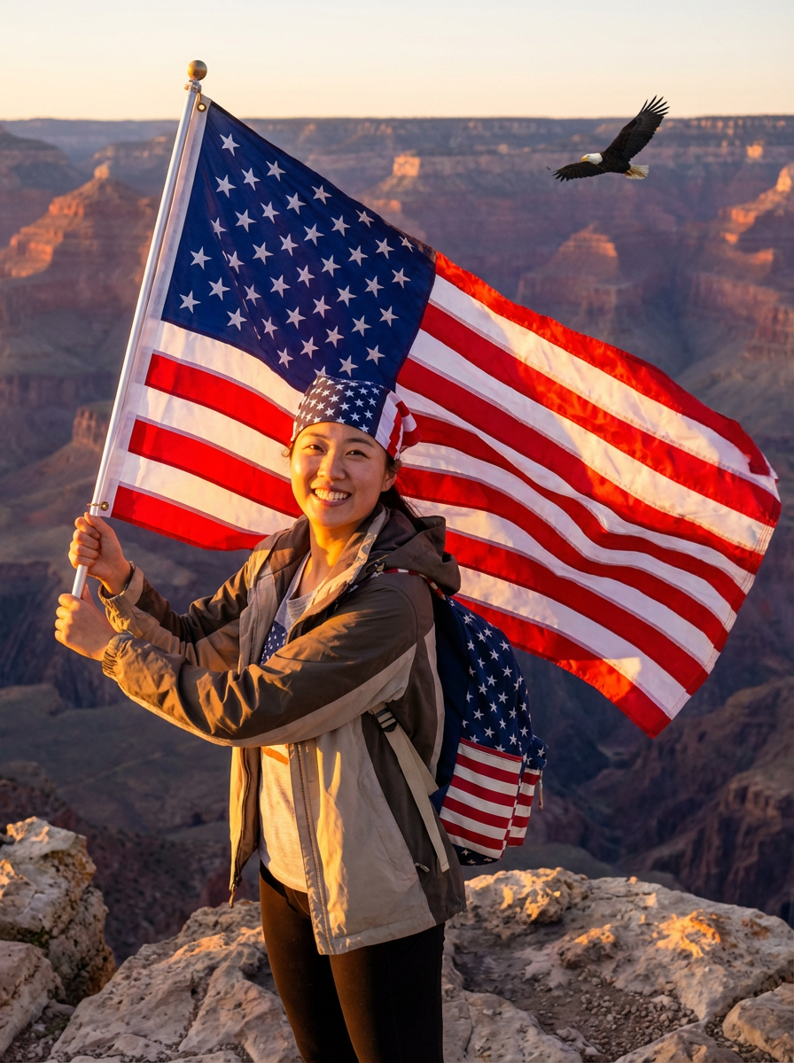 model at the Grand Canyon at sunset, wearing hiking attire with American flag bandana, stars and stripes backpack , proudly holding the American flag high, the majestic natural wonder stretching behind, bald eagle soaring overhead
