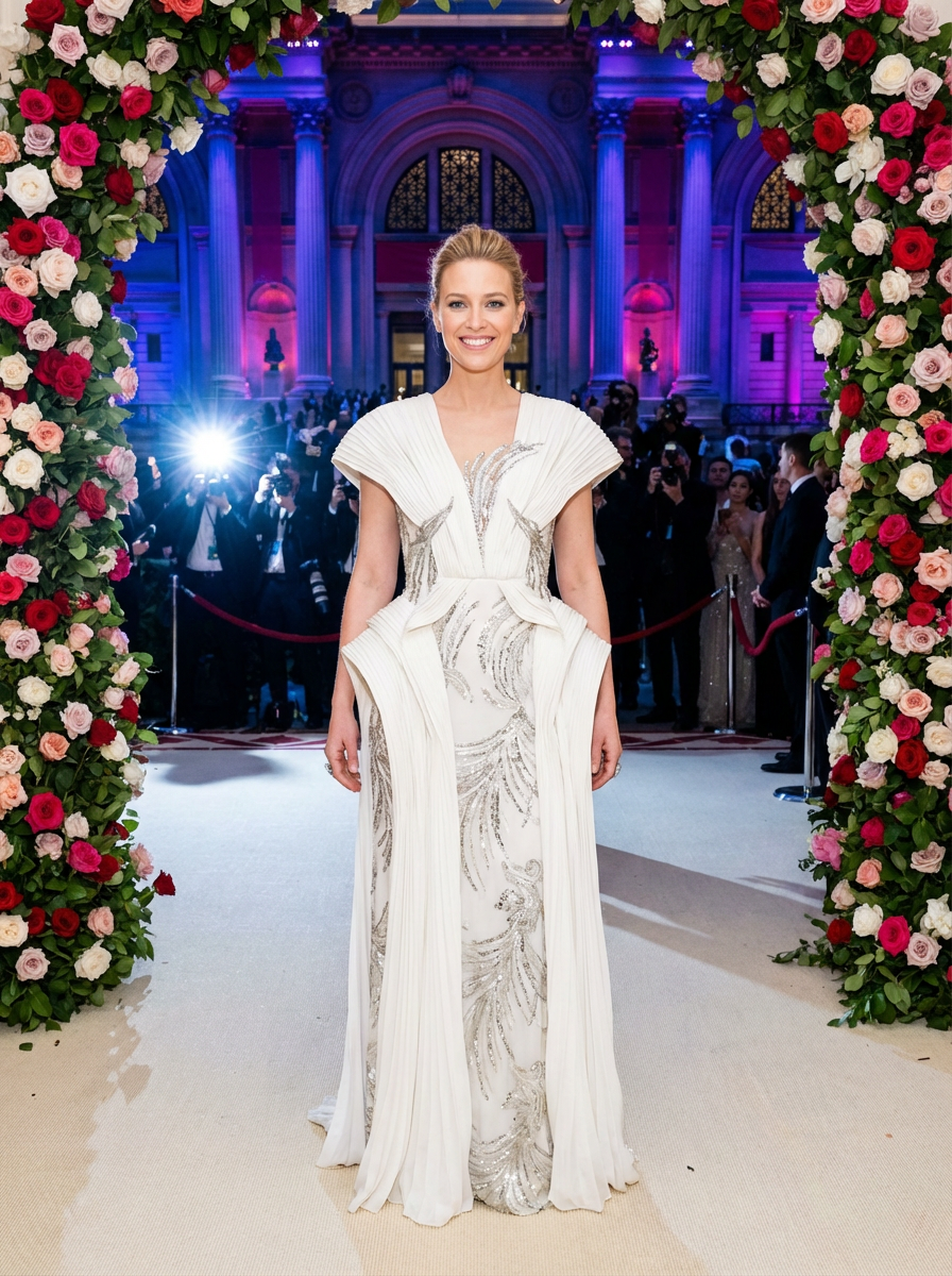 model at the Met Gala entrance with the famous flower-adorned archway, wearing a show-stopping gown with architectural elements , Metropolitan Museum façade illuminated with special event lighting