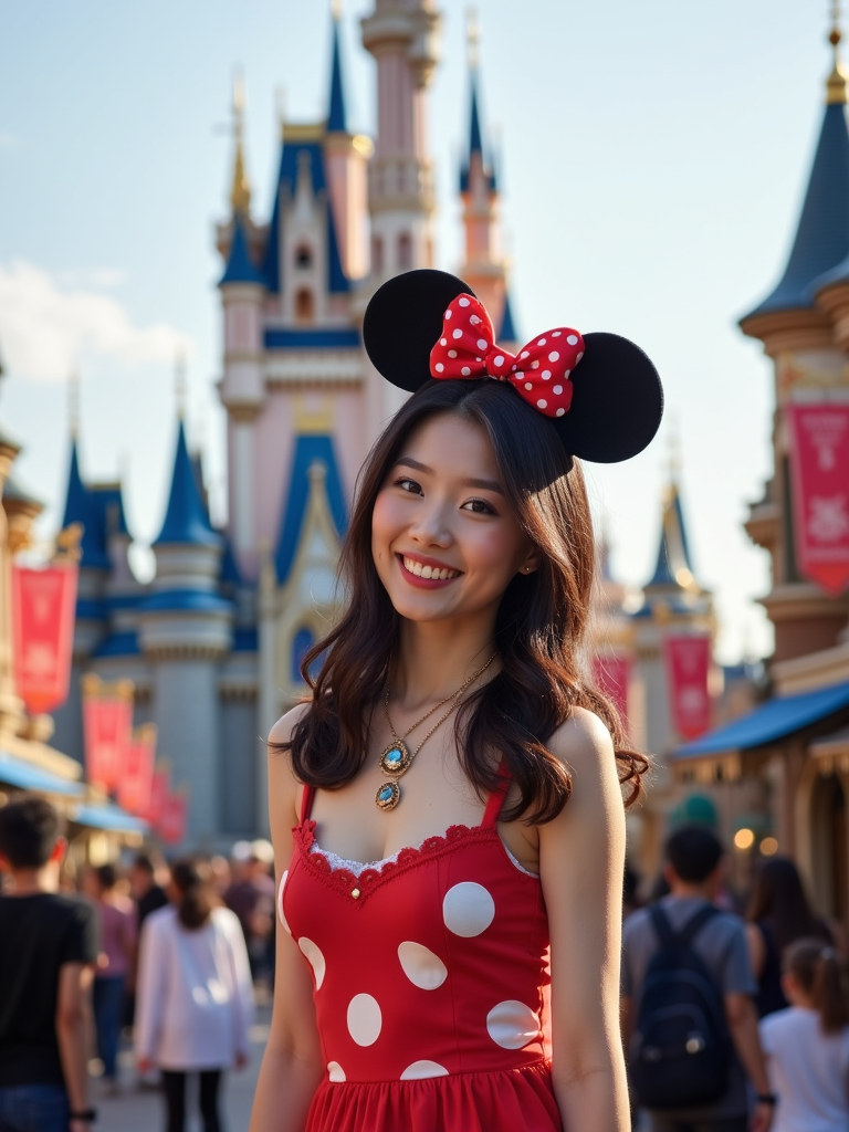 model at Tokyo DisneySea, wearing Mickey ears with cute Disney-themed outfit , castle in background
