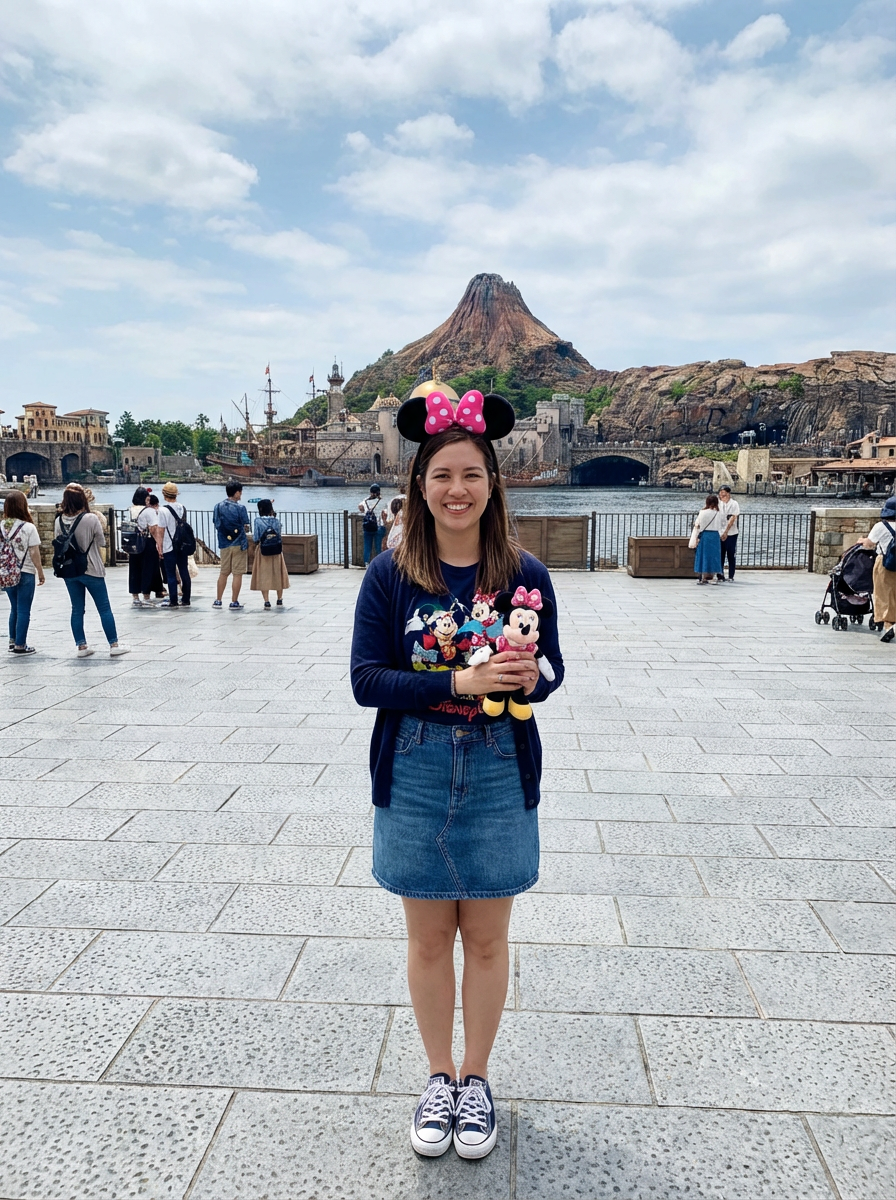 model at Tokyo DisneySea, wearing Mickey ears with cute Disney-themed outfit , castle in background
