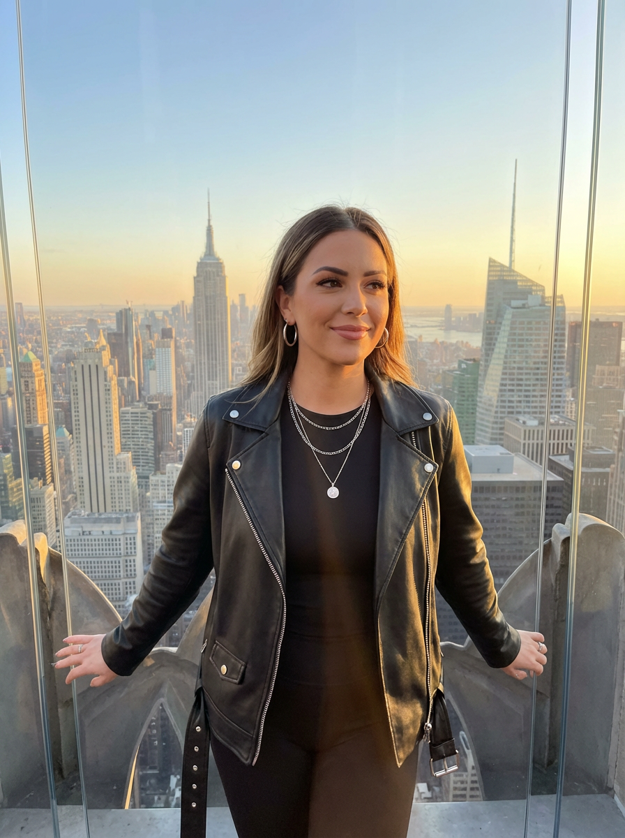 model at Top of the Rock, observation deck, NYC panorama behind, sunset golden hour