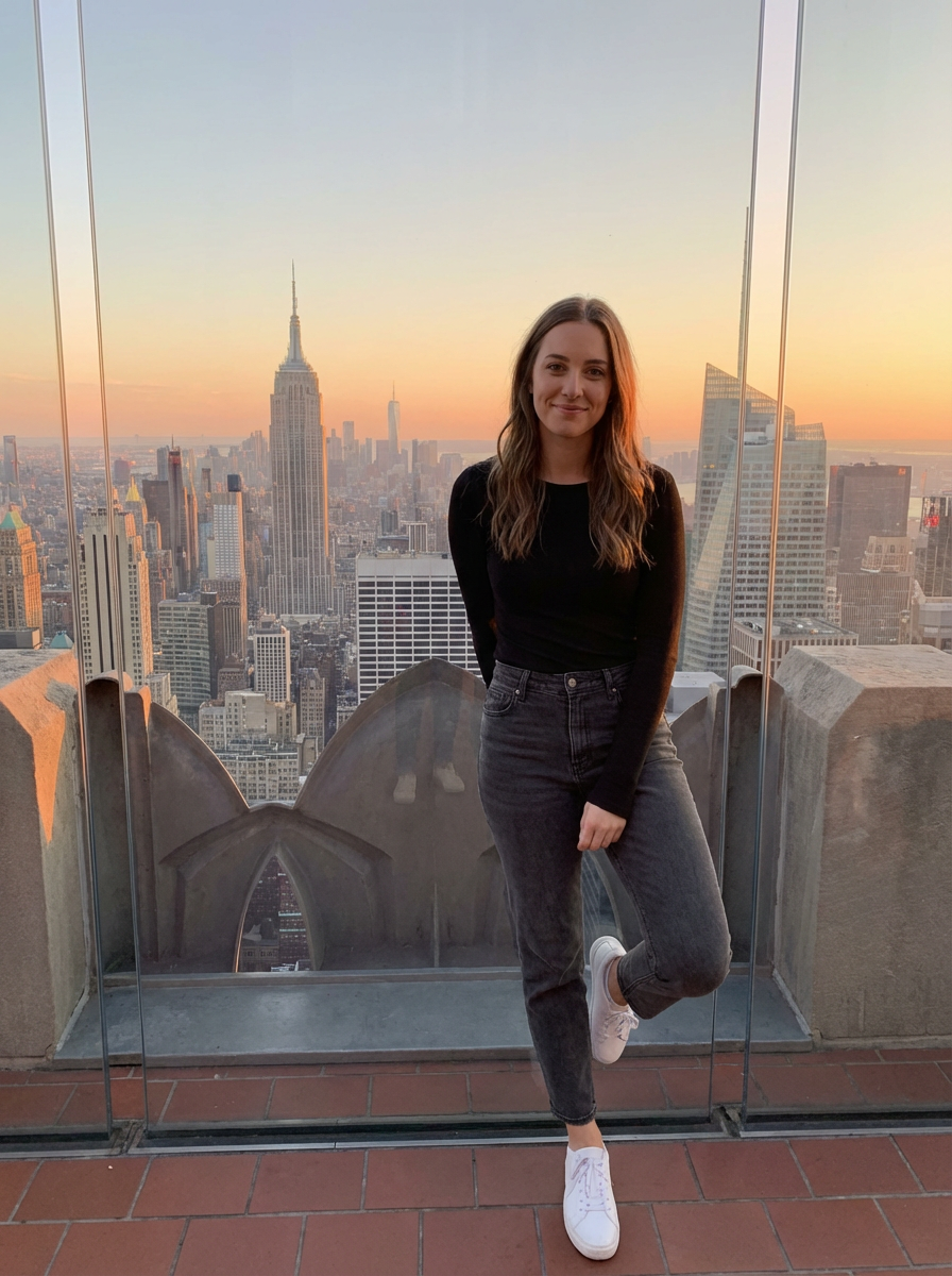 model at Top of the Rock, observation deck, NYC panorama behind, sunset golden hour