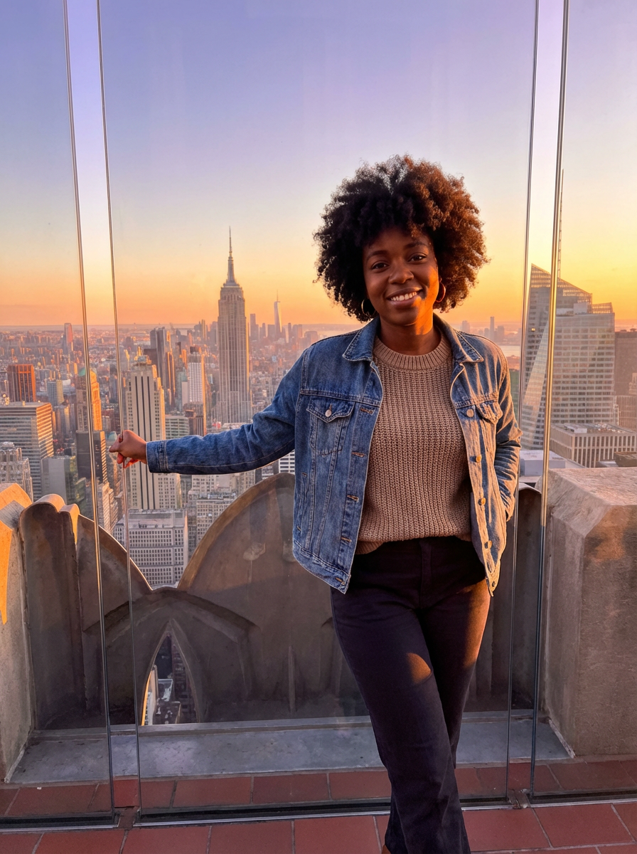 model at Top of the Rock, observation deck, NYC panorama behind, sunset golden hour