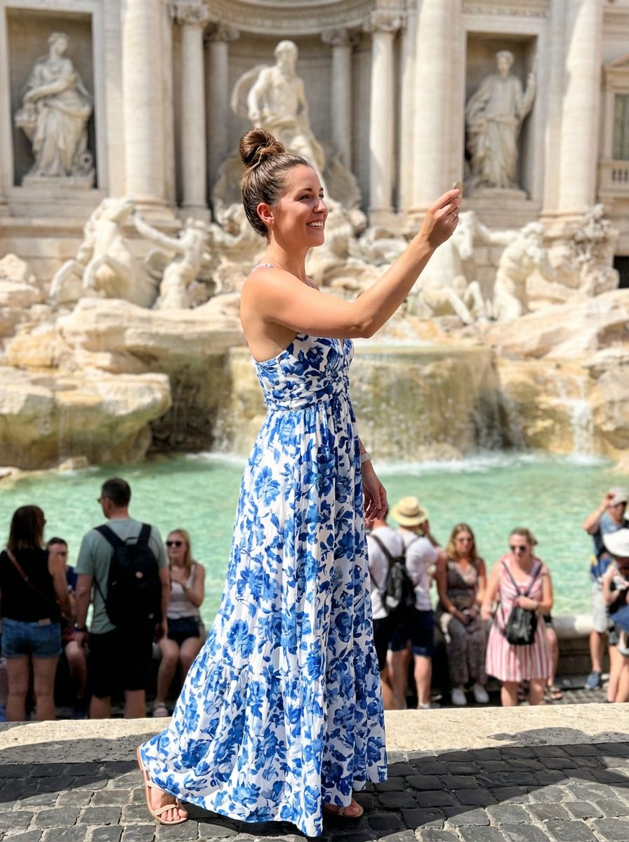 model at Trevi Fountain, throwing coin tradition, flowing summer dress , romantic scene