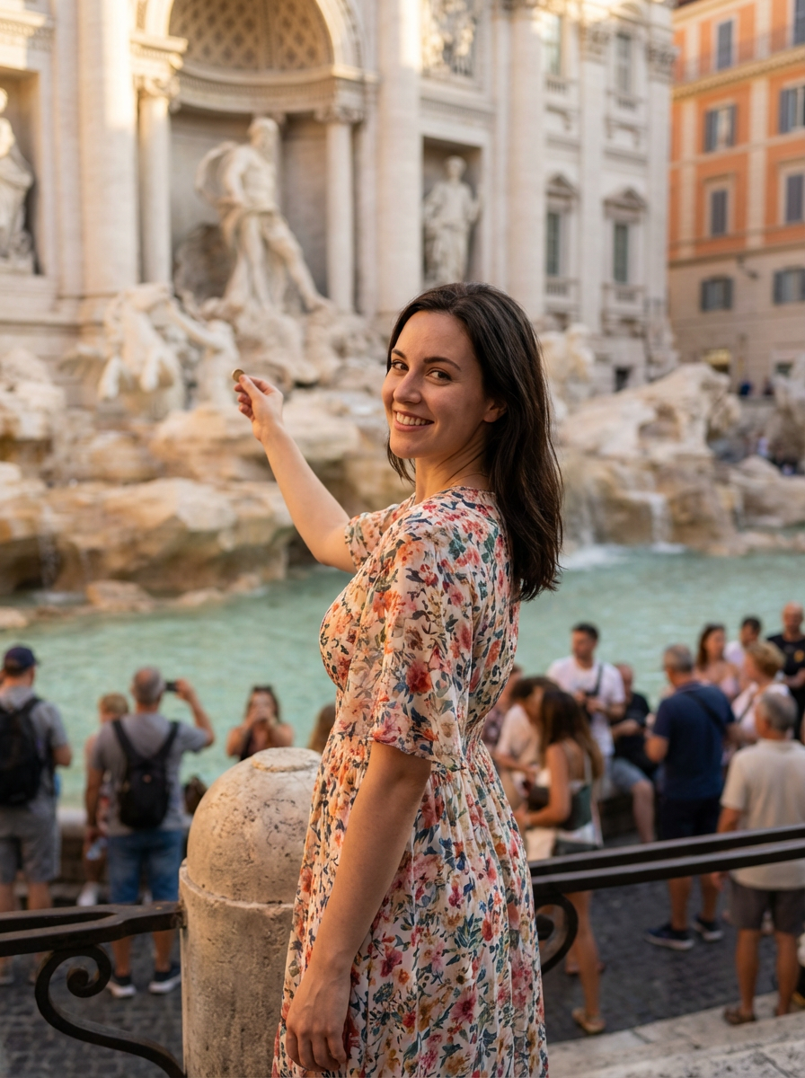 model at Trevi Fountain, throwing coin tradition, flowing summer dress , romantic scene