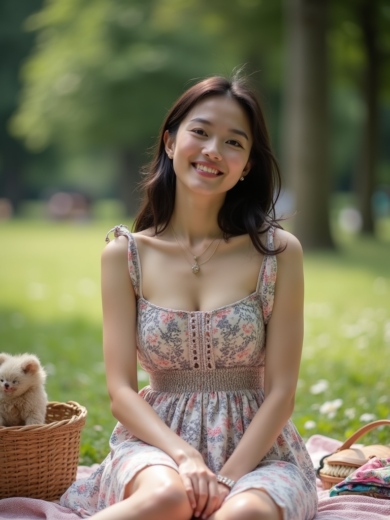 model at Tuileries Garden picnic, wearing a bohemian sundress with sandals , sitting on picnic blanket