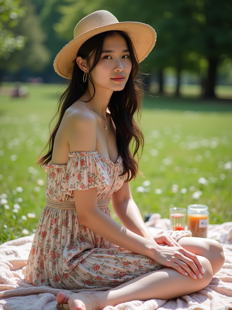 model at Tuileries Garden picnic, wearing a bohemian sundress with sandals , sitting on picnic blanket