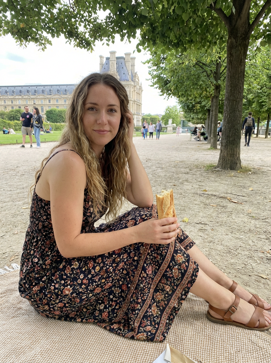 model at Tuileries Garden picnic, wearing a bohemian sundress with sandals , sitting on picnic blanket