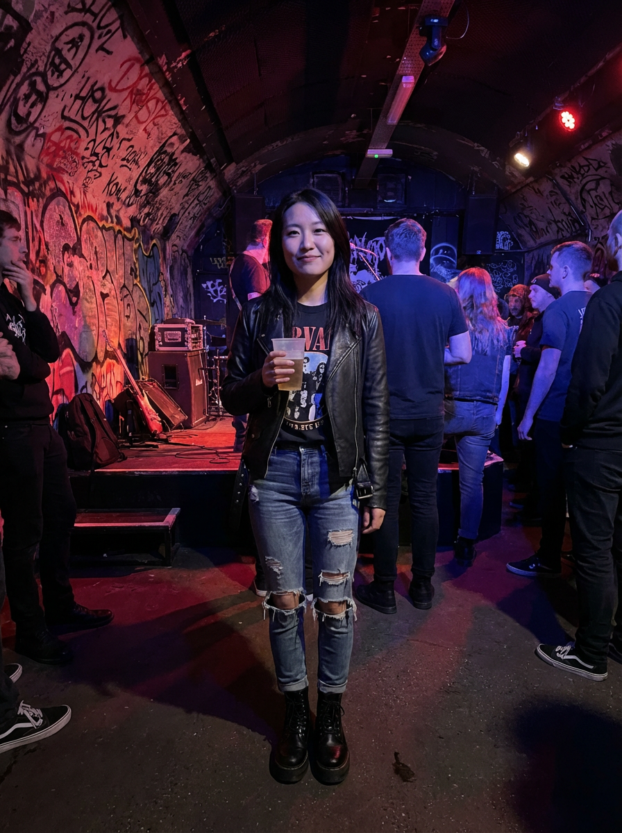 model at underground music venue, alternative scene aesthetic, edgy cool style