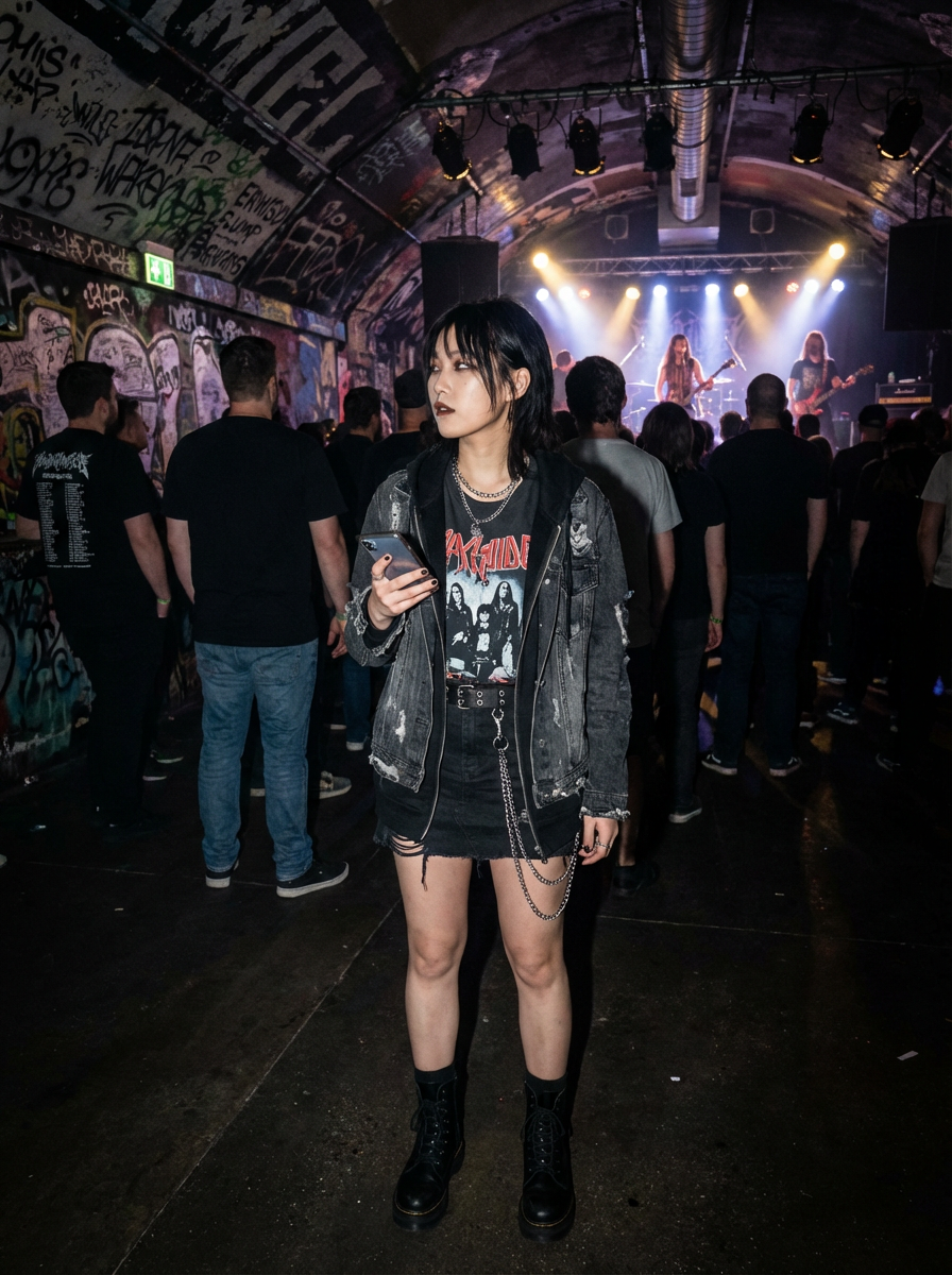 model at underground music venue, alternative scene aesthetic, edgy cool style