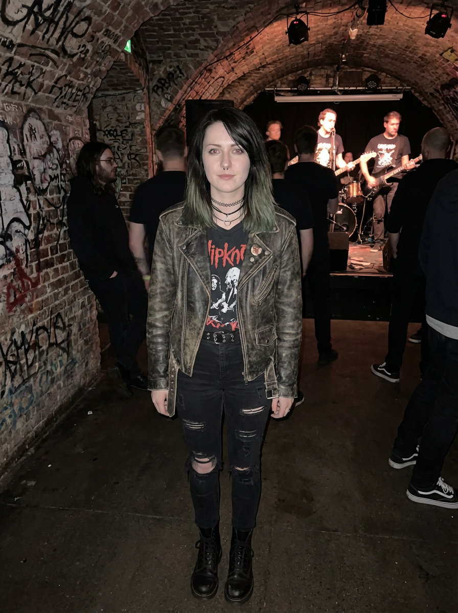 model at underground music venue, alternative scene aesthetic, edgy cool style