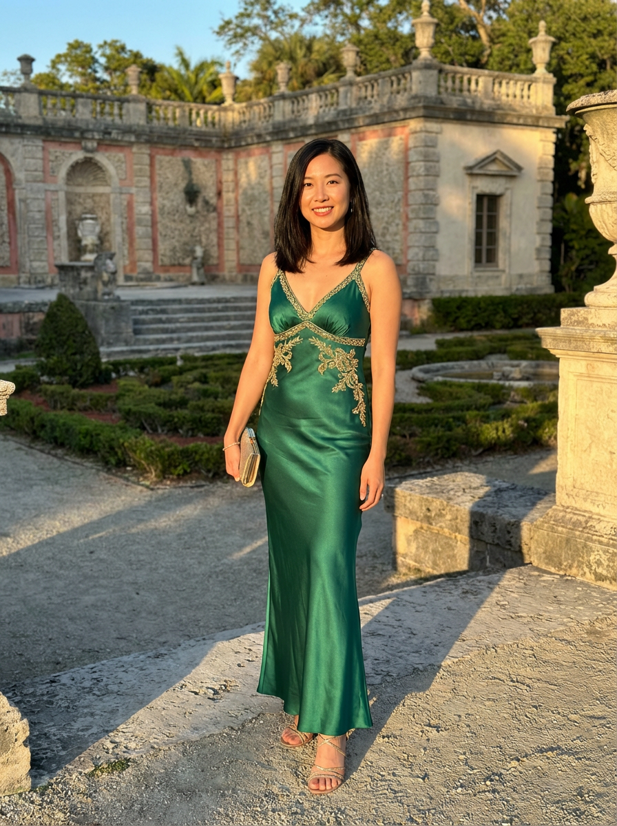 model at Vizcaya Museum gardens, Italian Renaissance backdrop, elegant outfit, golden hour