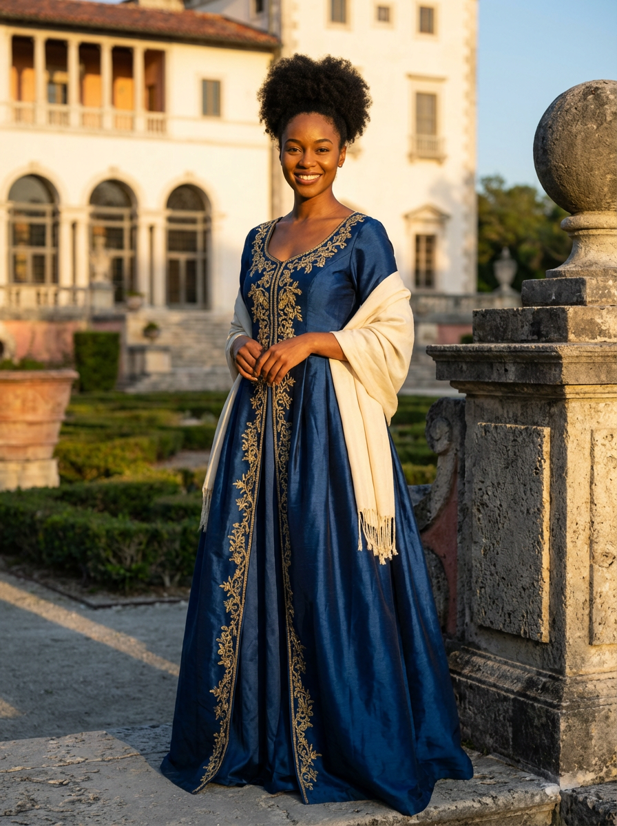 model at Vizcaya Museum gardens, Italian Renaissance backdrop, elegant outfit, golden hour