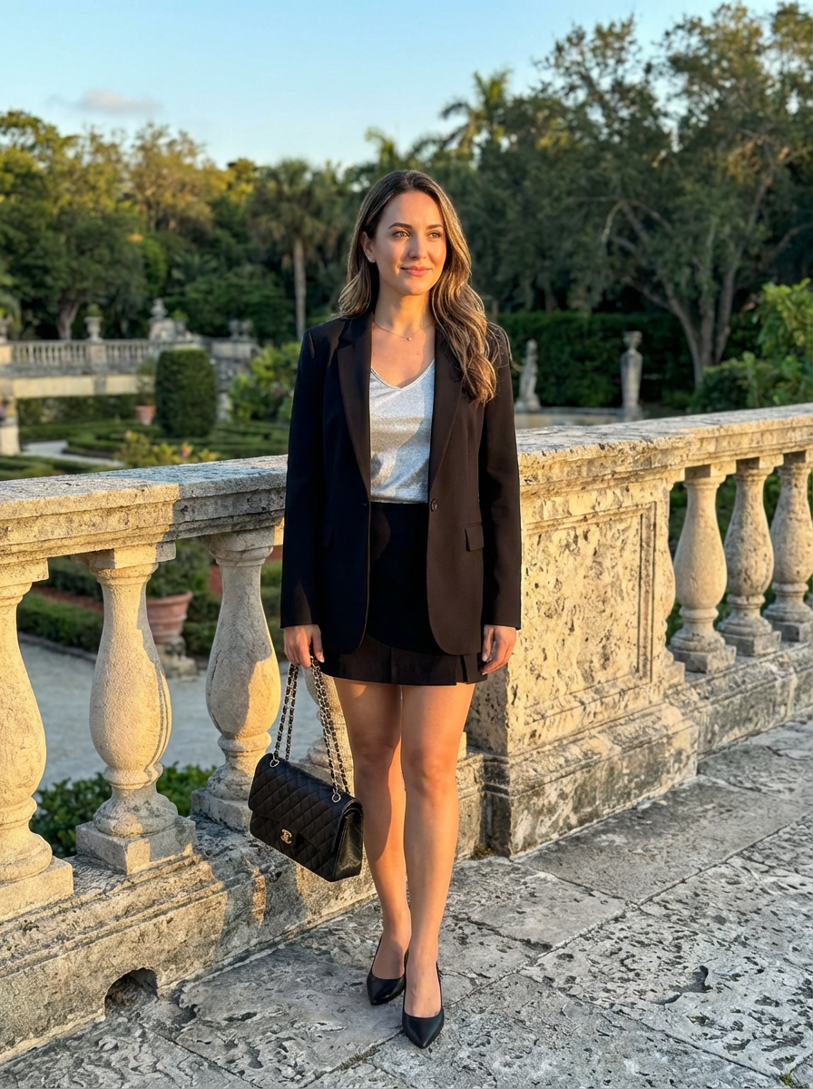 model at Vizcaya Museum gardens, Italian Renaissance backdrop, elegant outfit, golden hour
