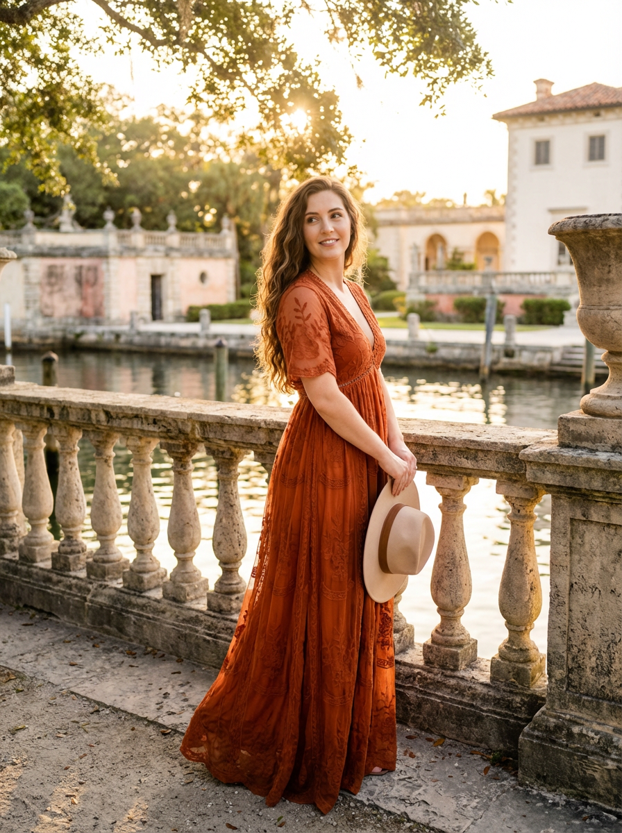 model at Vizcaya Museum gardens, Italian Renaissance backdrop, elegant outfit, golden hour