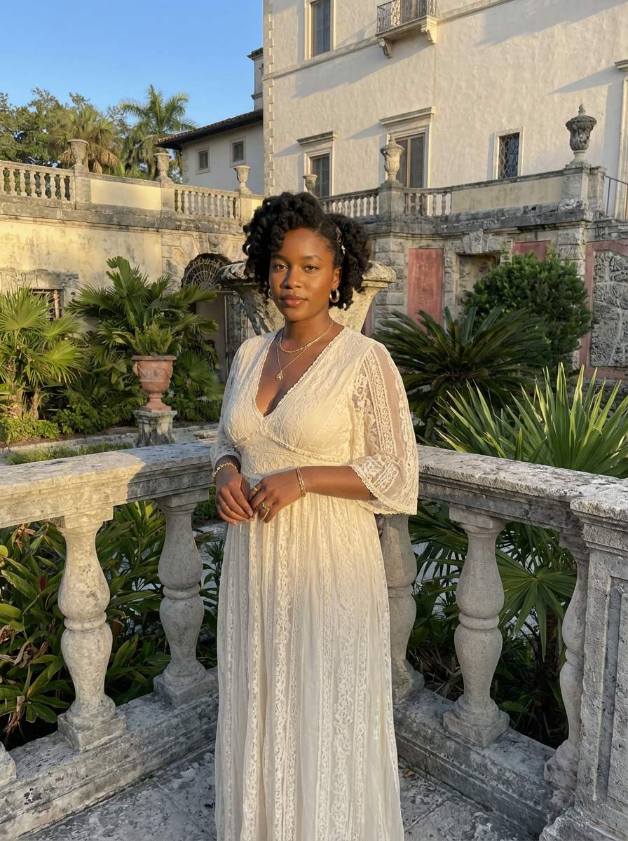 model at Vizcaya Museum gardens, Italian Renaissance backdrop, elegant outfit, golden hour