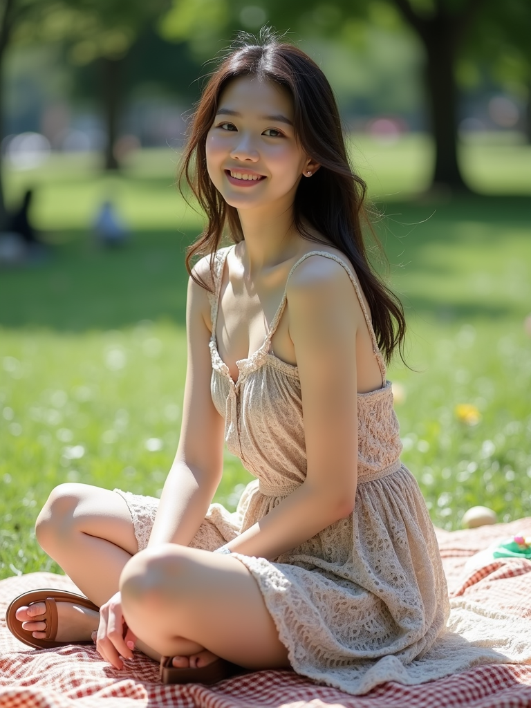 model at Yoyogi Park picnic, wearing a bohemian sundress with sandals , sitting on picnic blanket
