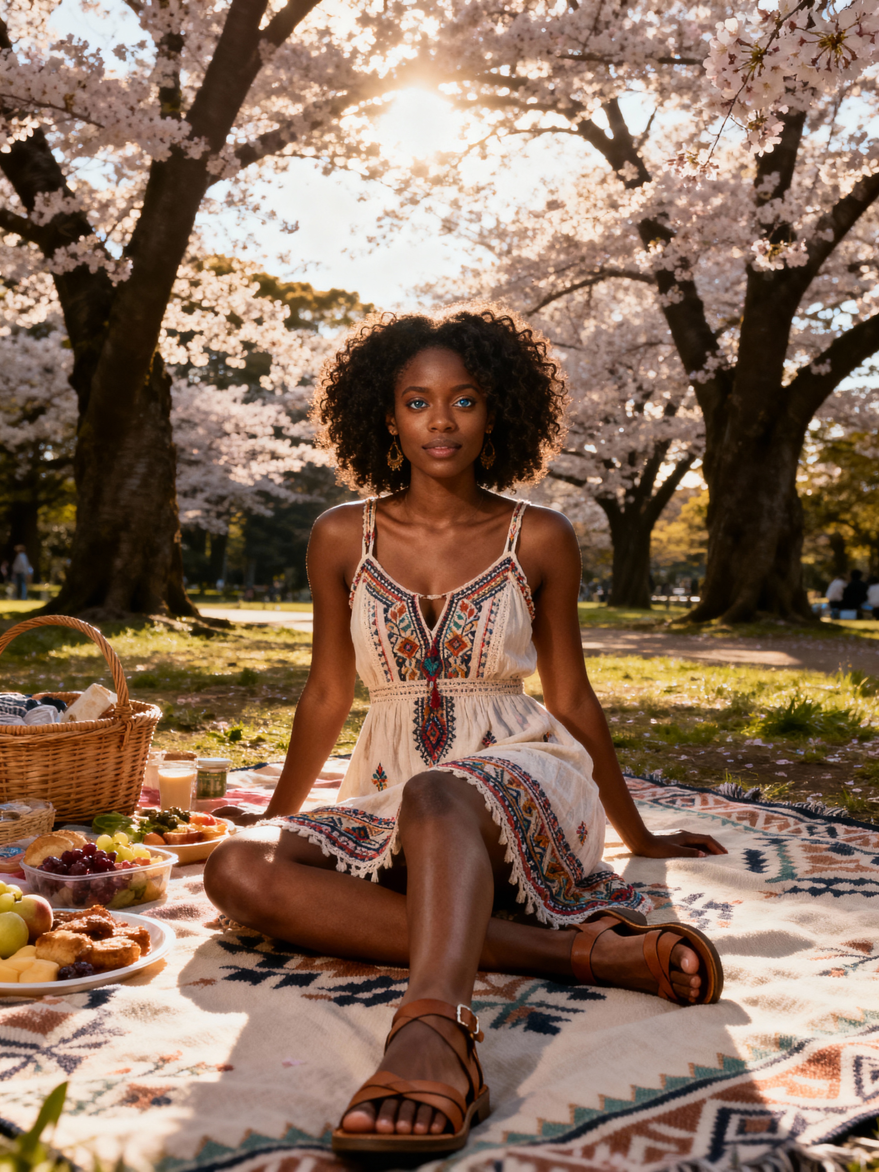 model at Yoyogi Park picnic, wearing a bohemian sundress with sandals , sitting on picnic blanket