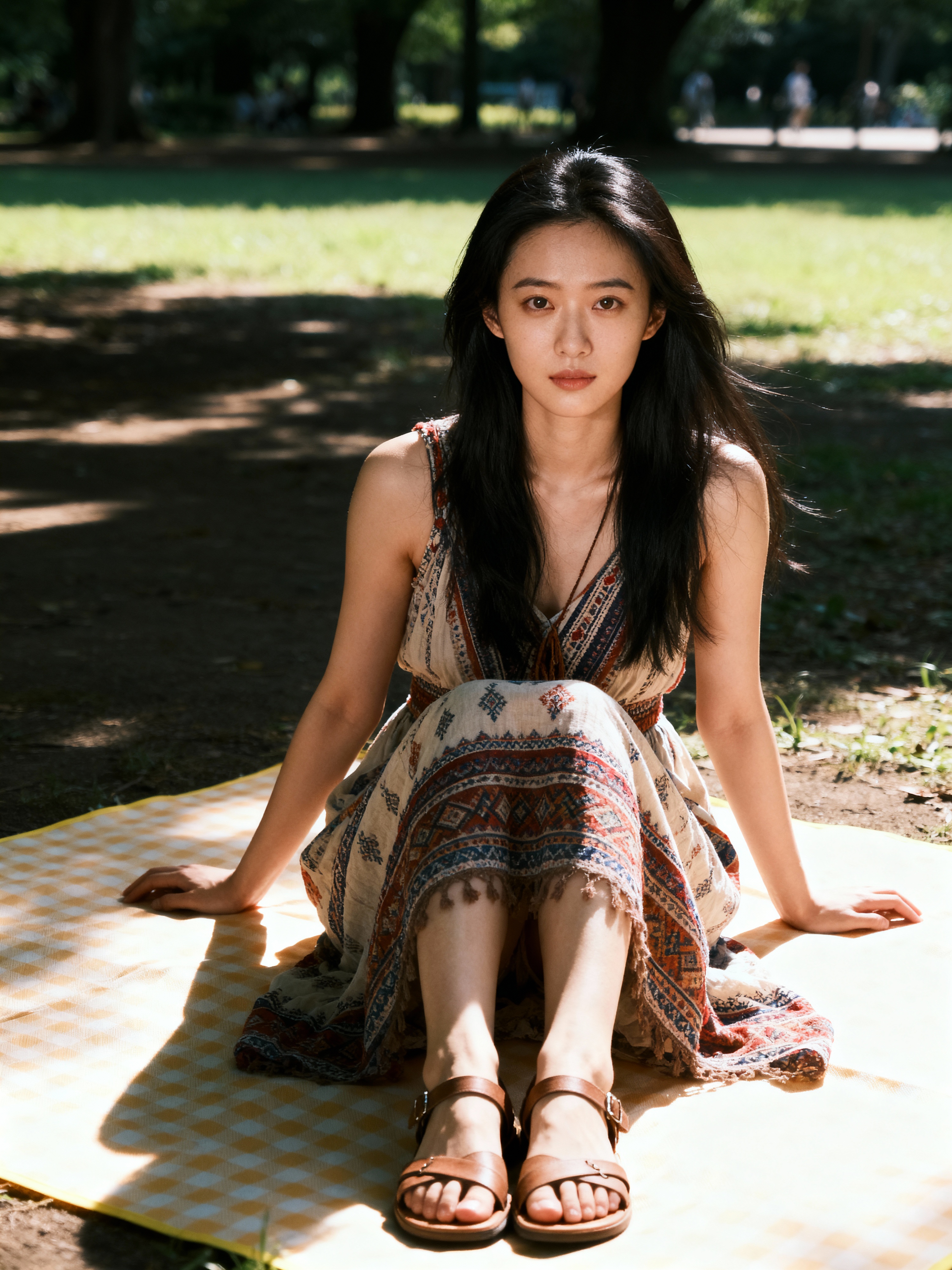 model at Yoyogi Park picnic, wearing a bohemian sundress with sandals , sitting on picnic blanket