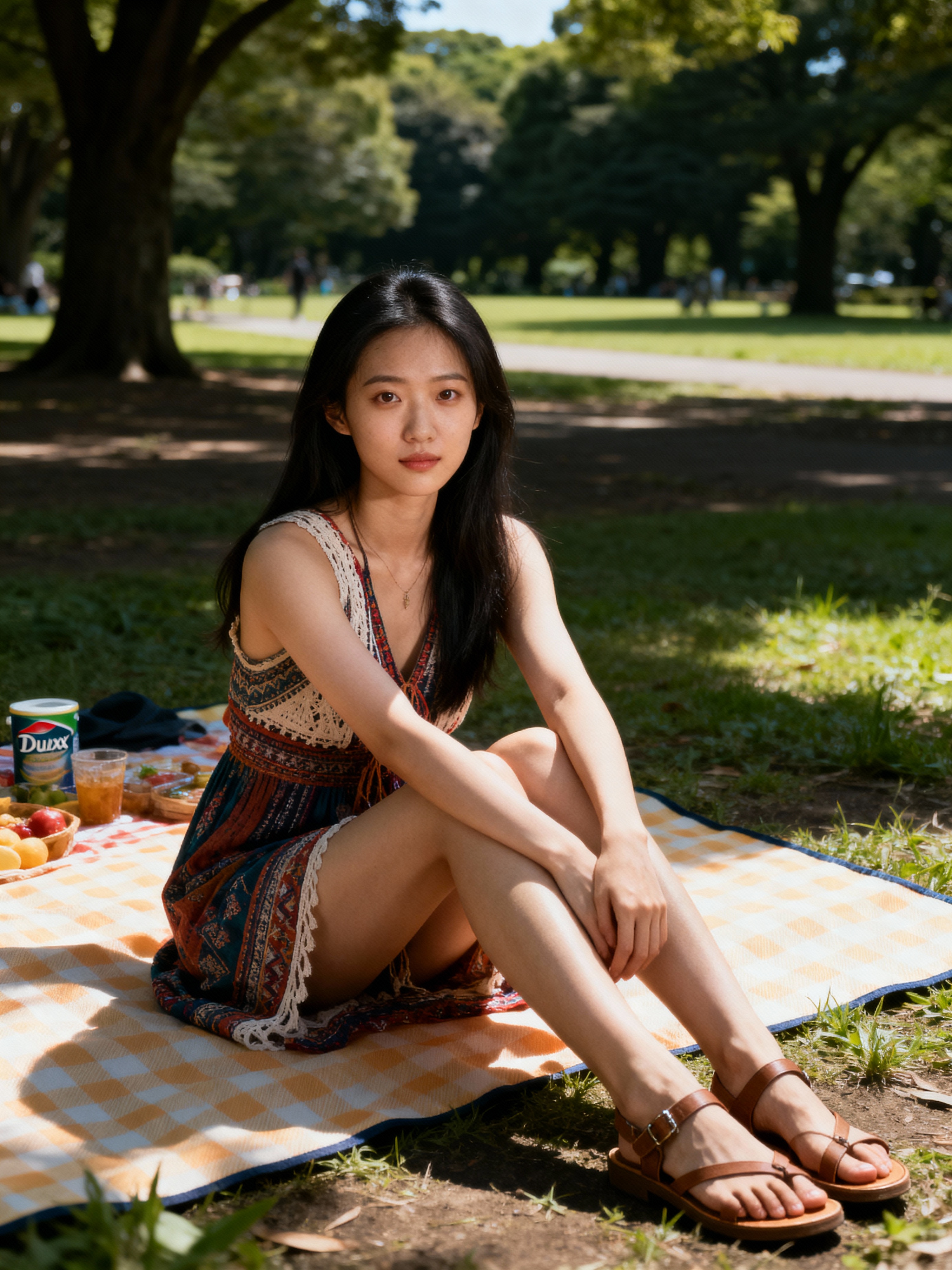 model at Yoyogi Park picnic, wearing a bohemian sundress with sandals , sitting on picnic blanket