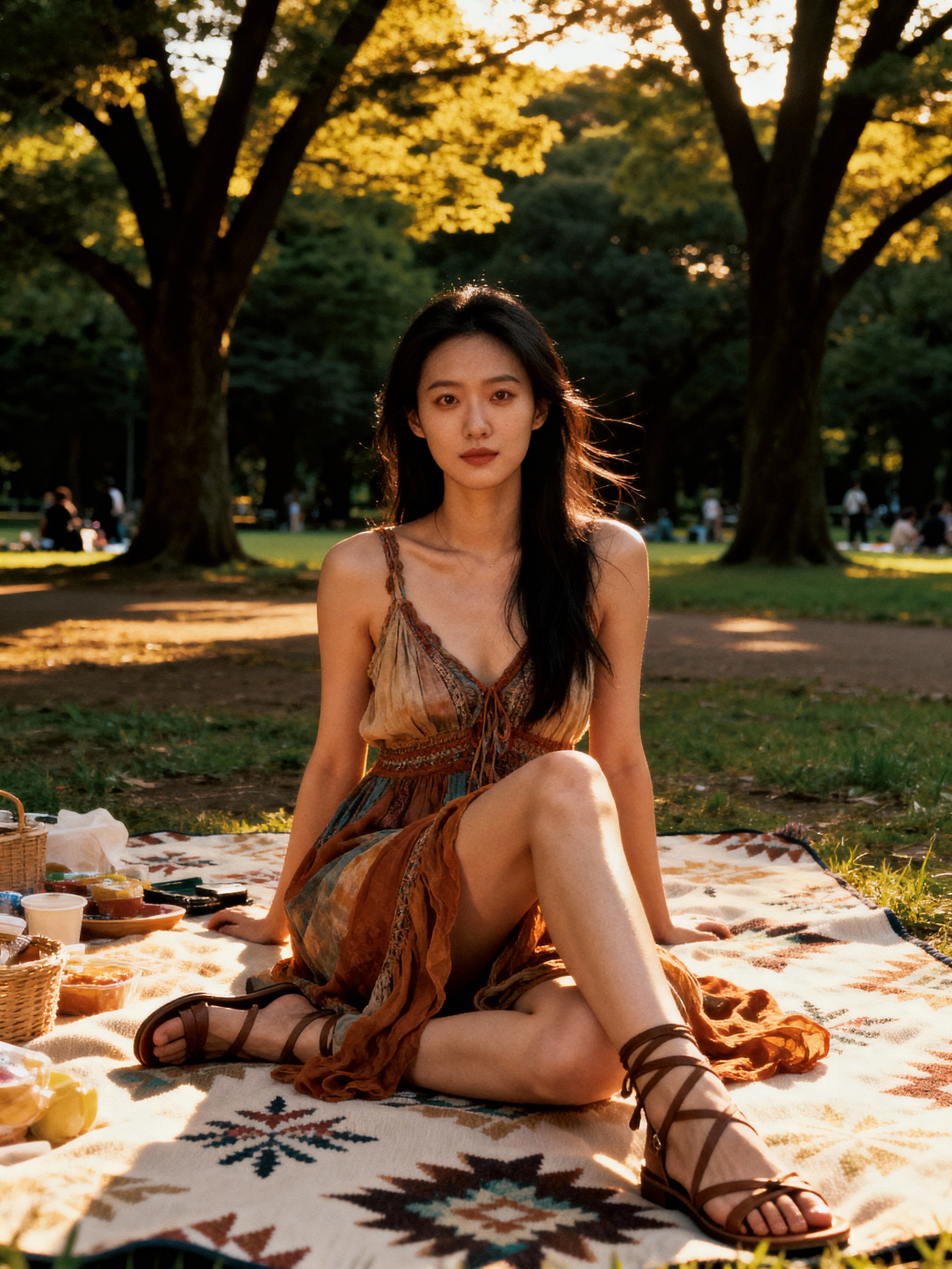 model at Yoyogi Park picnic, wearing a bohemian sundress with sandals , sitting on picnic blanket