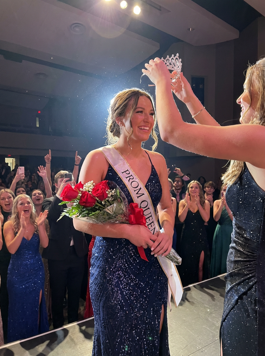 model being crowned prom royalty, tiara or crown moment, queen moment , spotlight scene