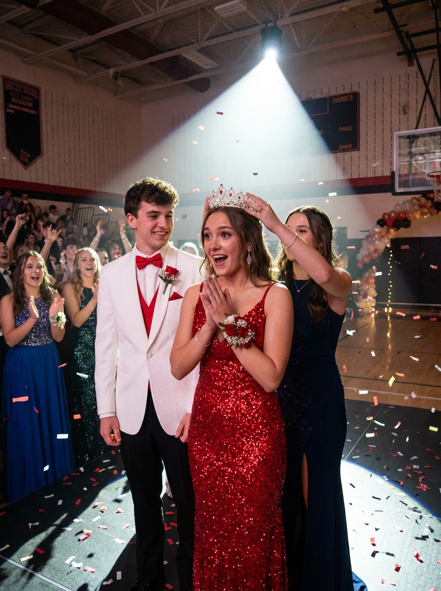 model being crowned prom royalty, tiara or crown moment, queen moment , spotlight scene