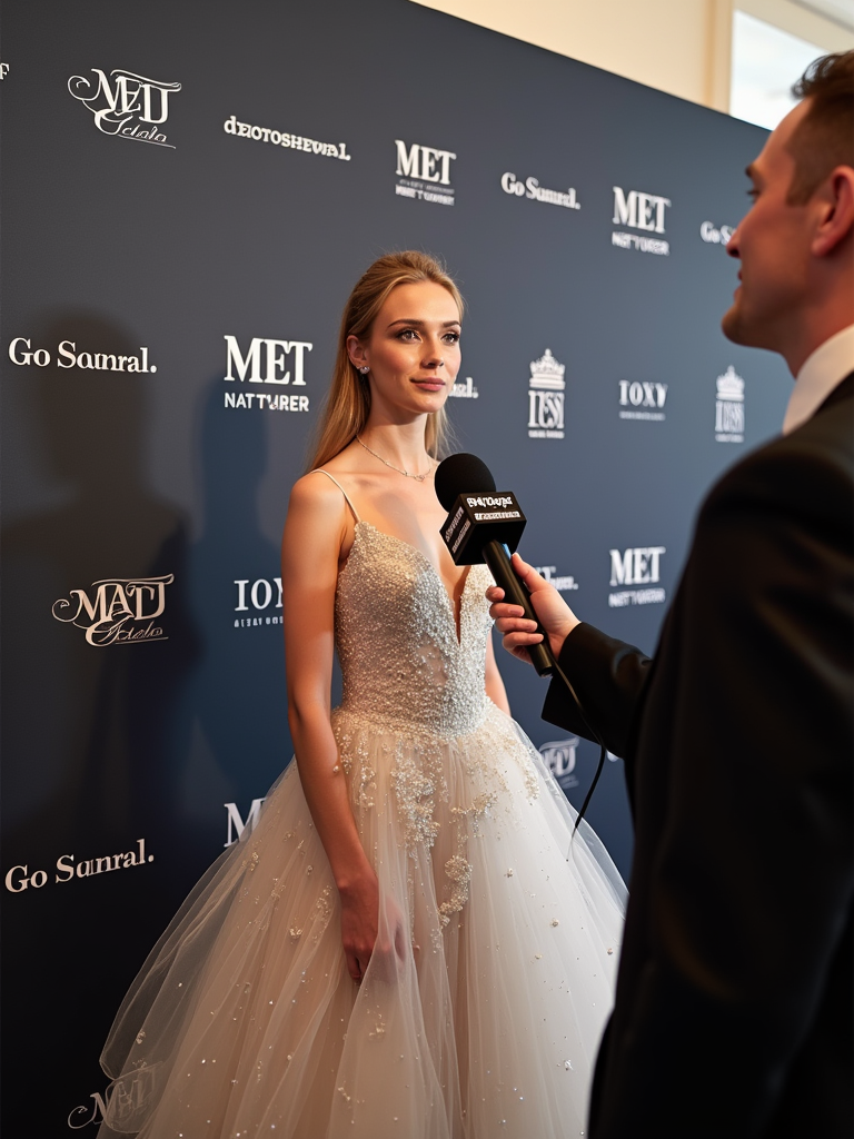 model being interviewed by fashion reporters at the Met Gala media wall, wearing an ethereal designer creation with celestial details , press and media backdrop with Met Gala logo and sponsors