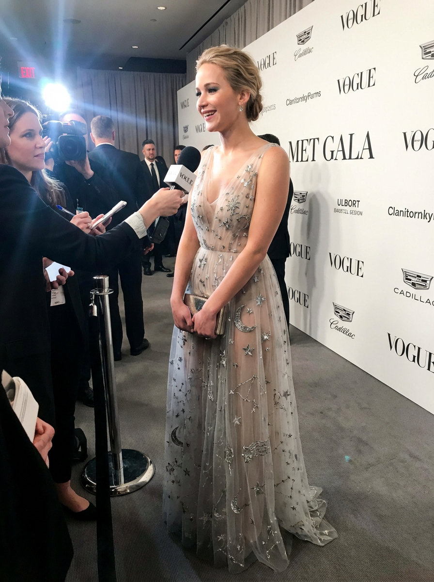 model being interviewed by fashion reporters at the Met Gala media wall, wearing an ethereal designer creation with celestial details , press and media backdrop with Met Gala logo and sponsors