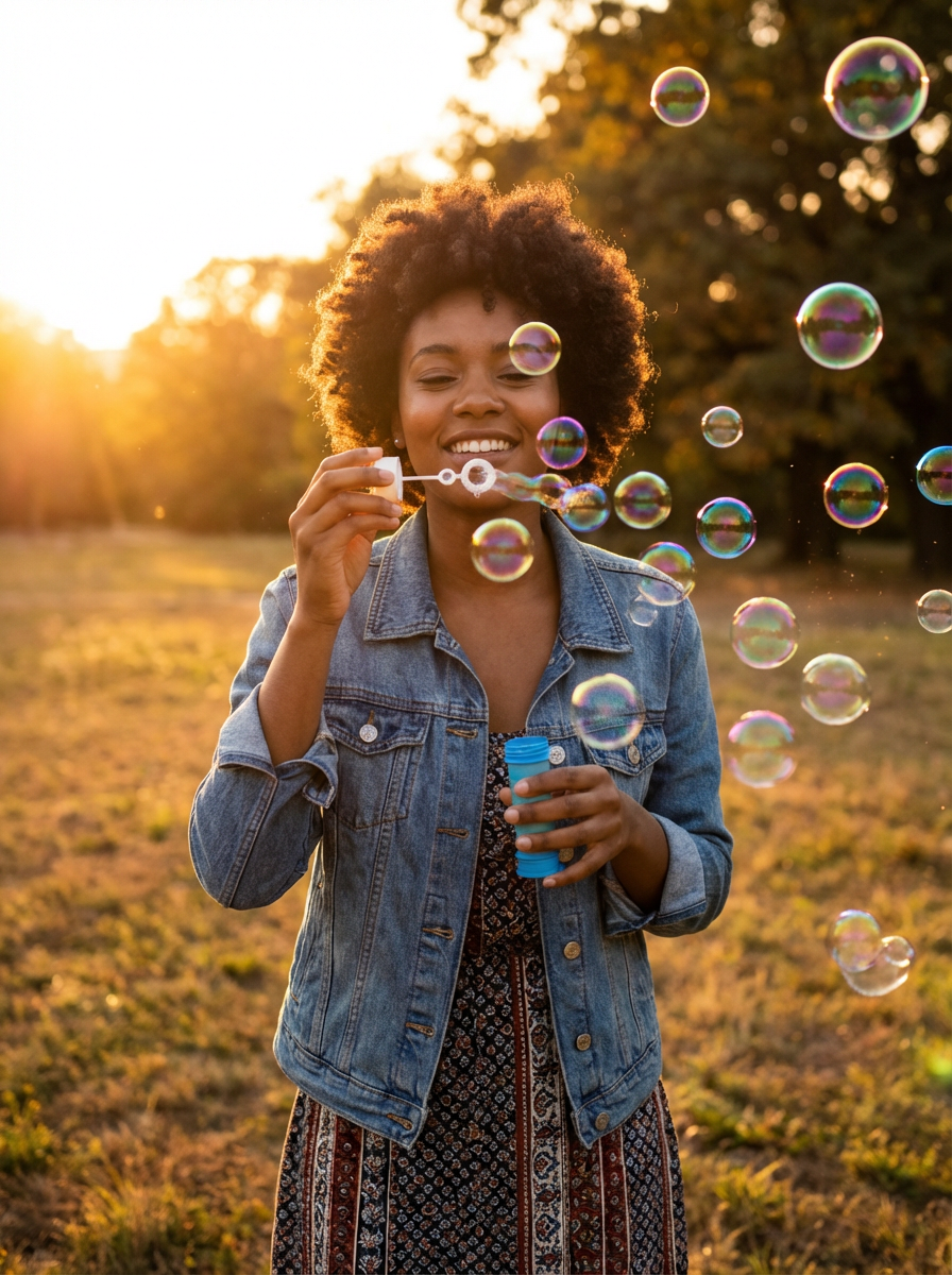 model blowing bubbles. all around her are floating bubbles. many bubbles floating. the bubbles reflect her face. it is golden hour at sunset.