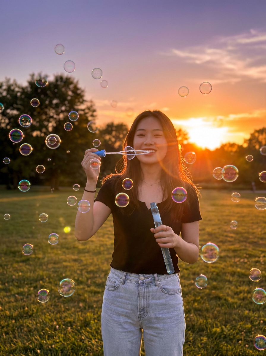 model blowing bubbles. all around her are floating bubbles. many bubbles floating. the bubbles reflect her face. it is golden hour at sunset.