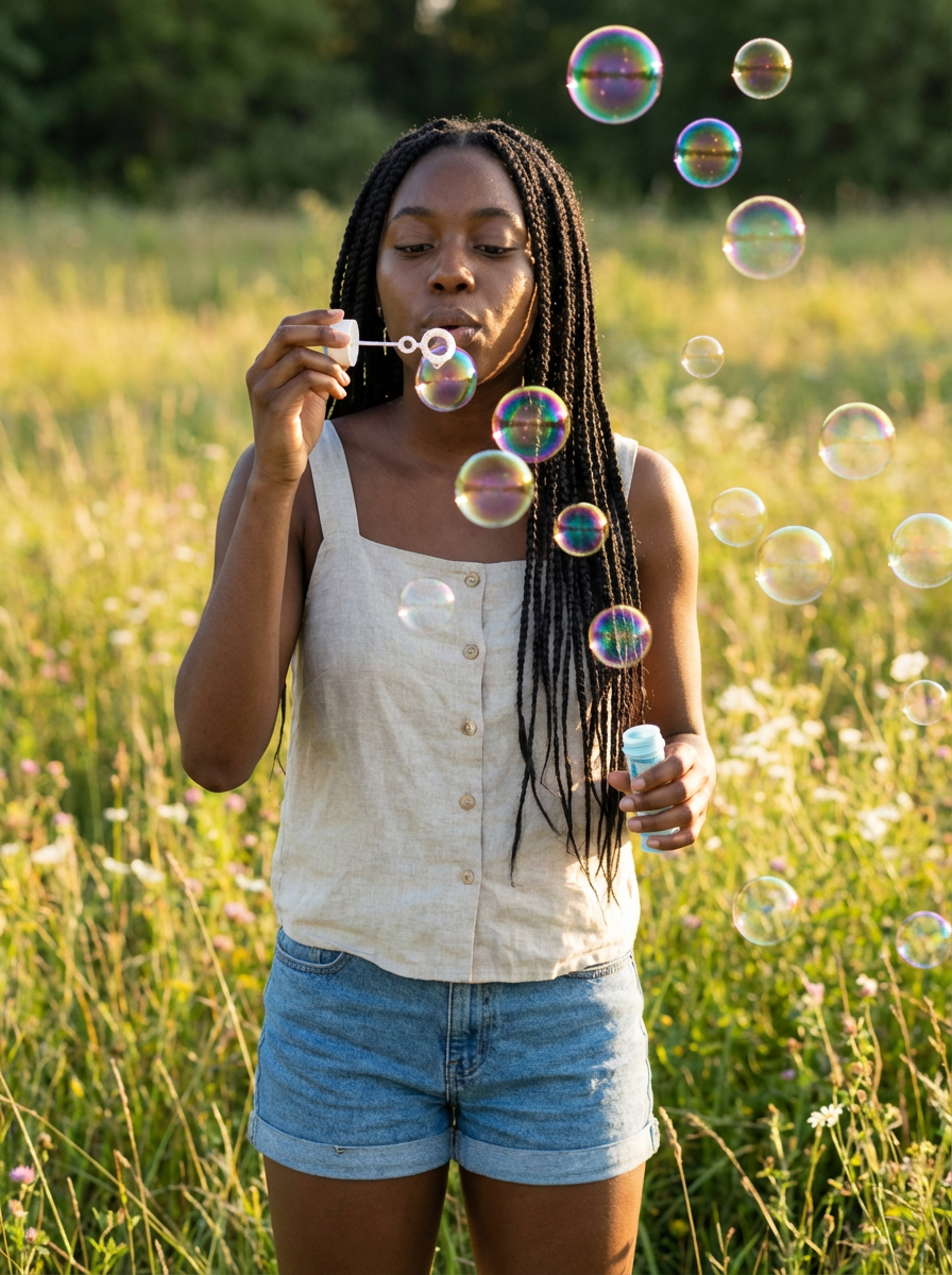model blowing bubbles. all around her are floating bubbles. many bubbles floating. the bubbles reflect her face. she stands in a sunlit field.