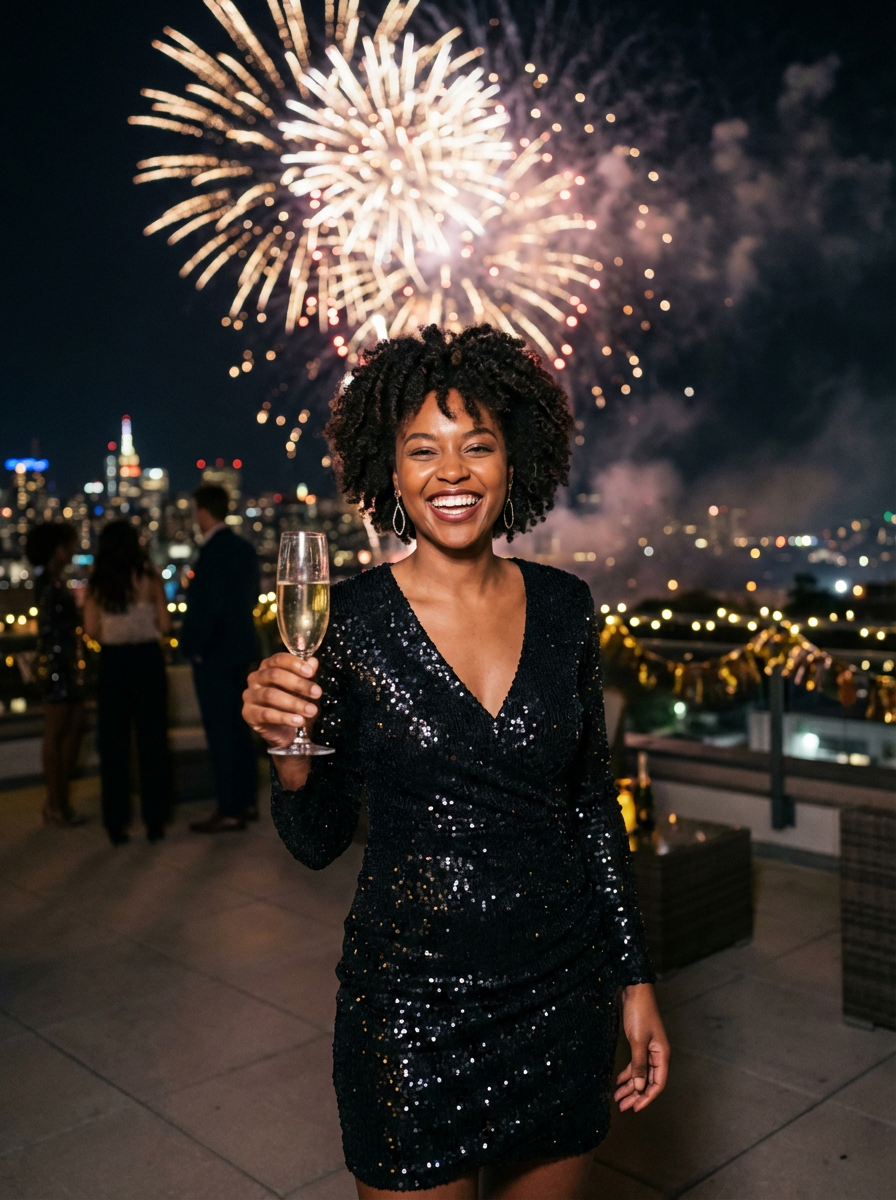 model celebrating New Year's Eve with champagne and Fireworks in background