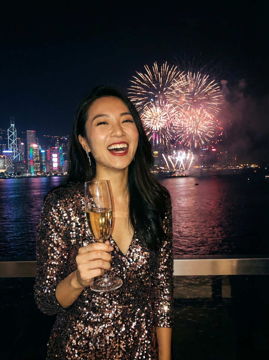 model celebrating New Year's Eve with champagne and Fireworks in background