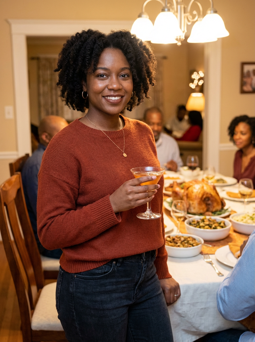 model celebrating Thanksgiving with cocktail and turkey meat in background