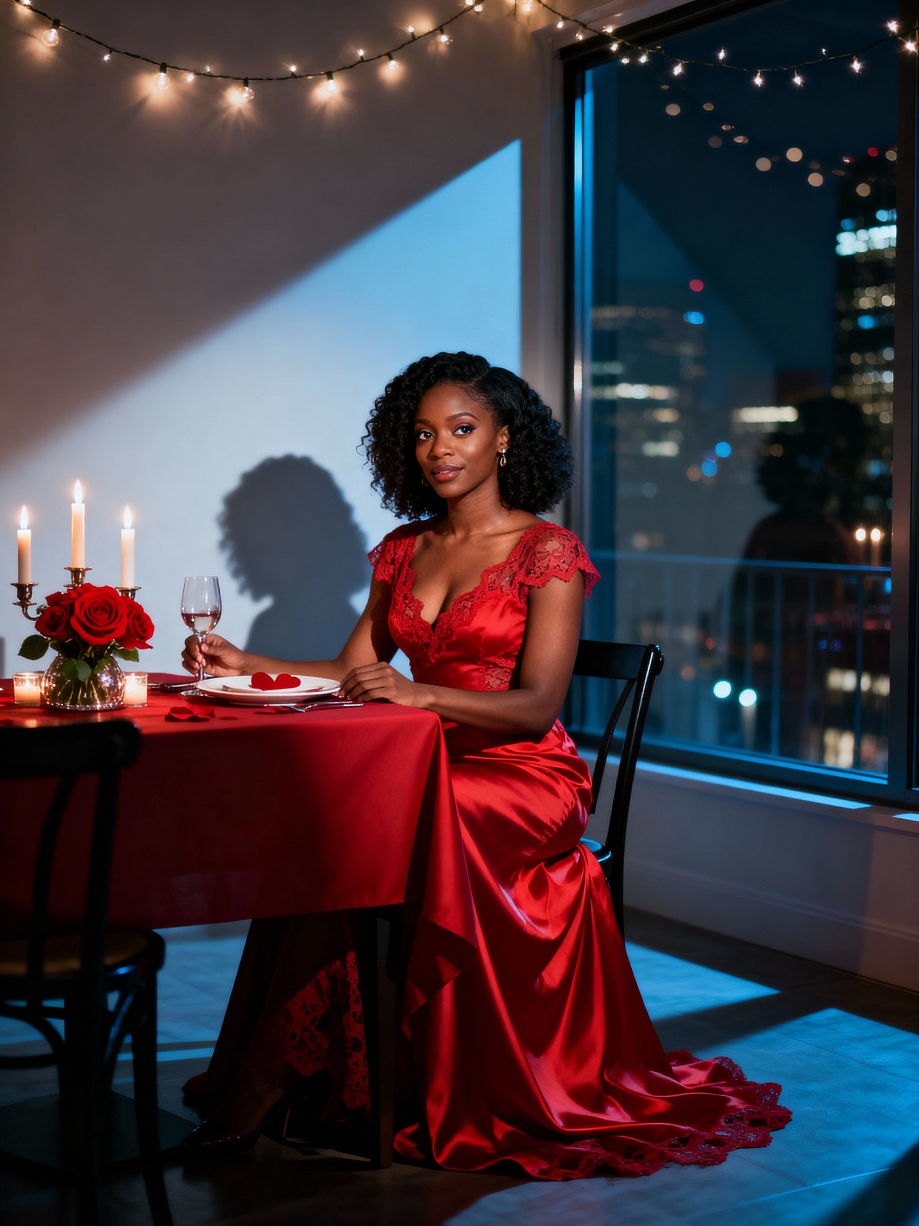 model celebrating Valentine's Day with romantic dinner