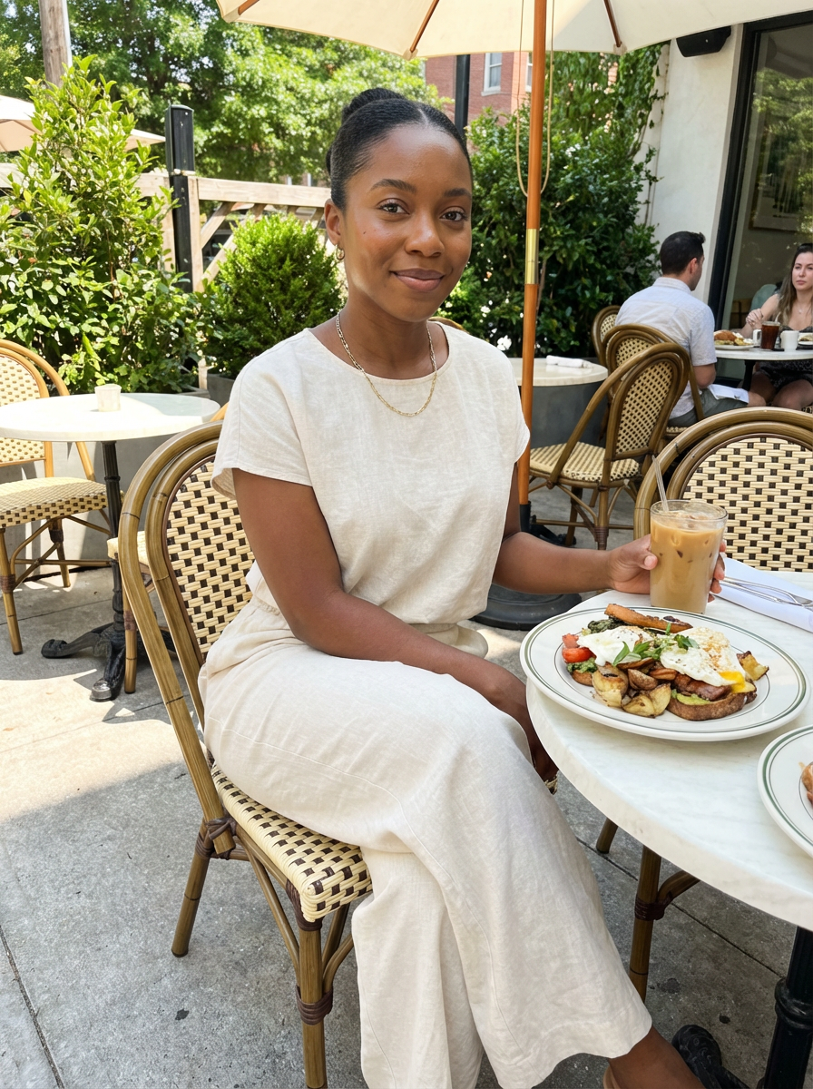 model clean girl brunch look, linen outfit, simple gold necklace, natural glowy makeup, outdoor cafe