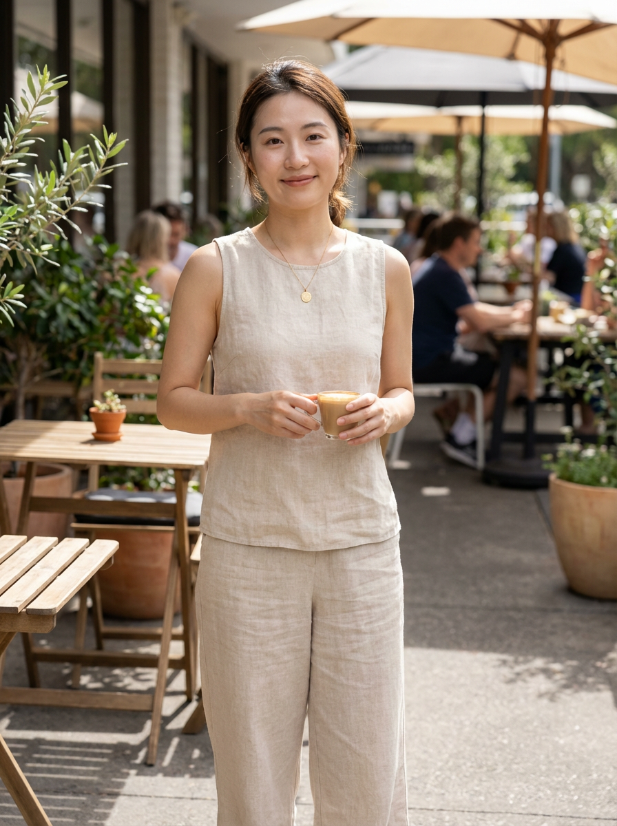 model clean girl brunch look, linen outfit, simple gold necklace, natural glowy makeup, outdoor cafe