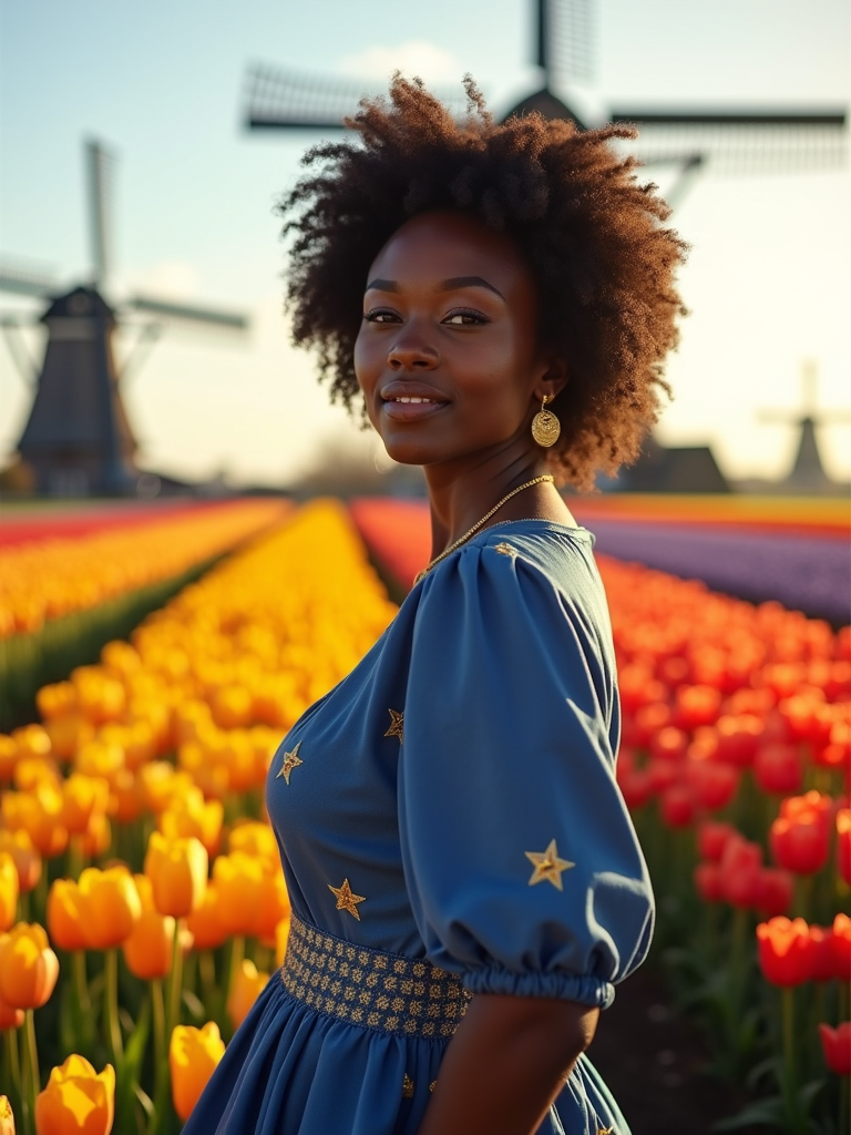 model confidently posed in Amsterdam during tulip season, surrounded by vibrant fields of blue, yellow, and red flowers. She is dressed in classic Dutch-inspired clothes with European touches, adorned with a blue dress with gold star embroidery , traditional windmills visible in the background. The scene is enhanced by golden sunlight and a gentle breeze carrying flower petals.