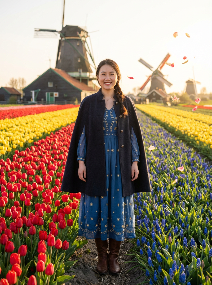 model confidently posed in Amsterdam during tulip season, surrounded by vibrant fields of blue, yellow, and red flowers. She is dressed in classic Dutch-inspired clothes with European touches, adorned with a blue dress with gold star embroidery , traditional windmills visible in the background. The scene is enhanced by golden sunlight and a gentle breeze carrying flower petals.