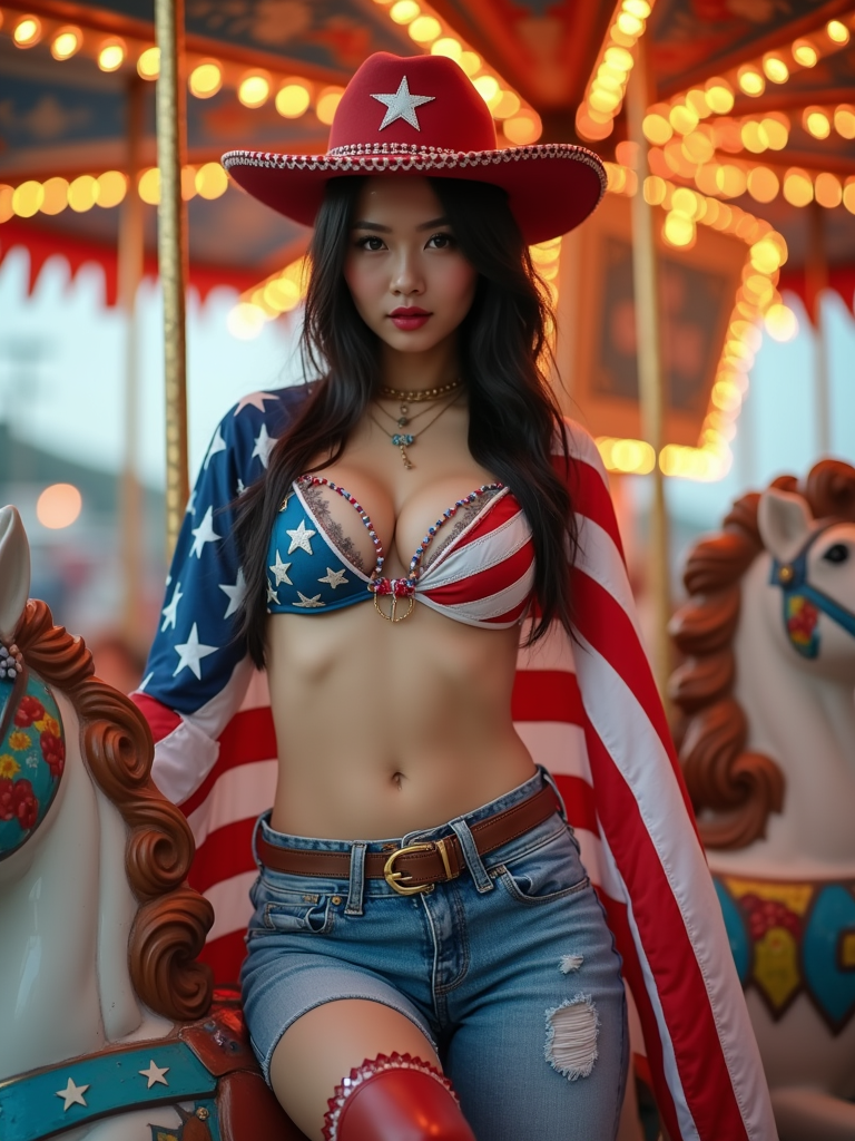model confidently posed on top of a vibrant carnival carousel horse painted in stars and stripes, the scene bursting with red, white, and blue colors. she is dressed in classic american western clothes, adorned with a stars and stripes bikini, denim hot pants with flag patches , accentuating her red, white and blue cowboy boots. the ensemble is completed with a stars and stripes cowboy hat, American flag draped over her shoulders. the carnival atmosphere is enhanced by patriotic bunting and twinkling red, white, and blue lights.