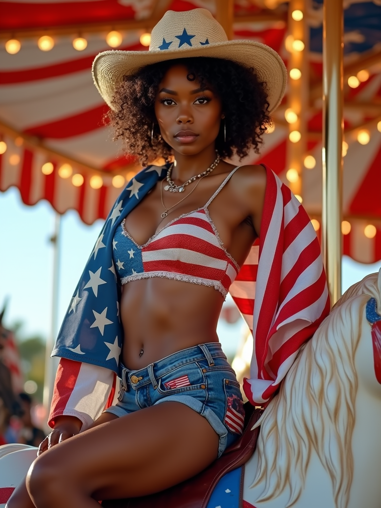 model confidently posed on top of a vibrant carnival carousel horse painted in stars and stripes, the scene bursting with red, white, and blue colors. she is dressed in classic american western clothes, adorned with a stars and stripes bikini, denim hot pants with flag patches , accentuating her red, white and blue cowboy boots. the ensemble is completed with a stars and stripes cowboy hat, American flag draped over her shoulders. the carnival atmosphere is enhanced by patriotic bunting and twinkling red, white, and blue lights.