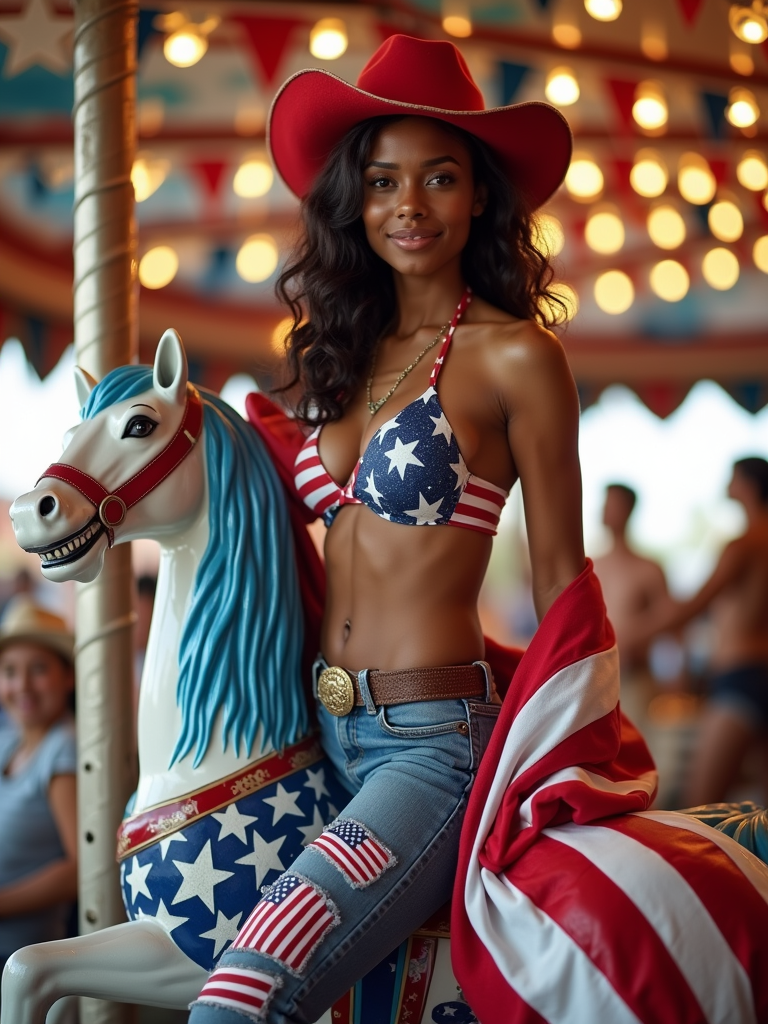 model confidently posed on top of a vibrant carnival carousel horse painted in stars and stripes, the scene bursting with red, white, and blue colors. she is dressed in classic american western clothes, adorned with a stars and stripes bikini, denim hot pants with flag patches , accentuating her red, white and blue cowboy boots. the ensemble is completed with a stars and stripes cowboy hat, American flag draped over her shoulders. the carnival atmosphere is enhanced by patriotic bunting and twinkling red, white, and blue lights.